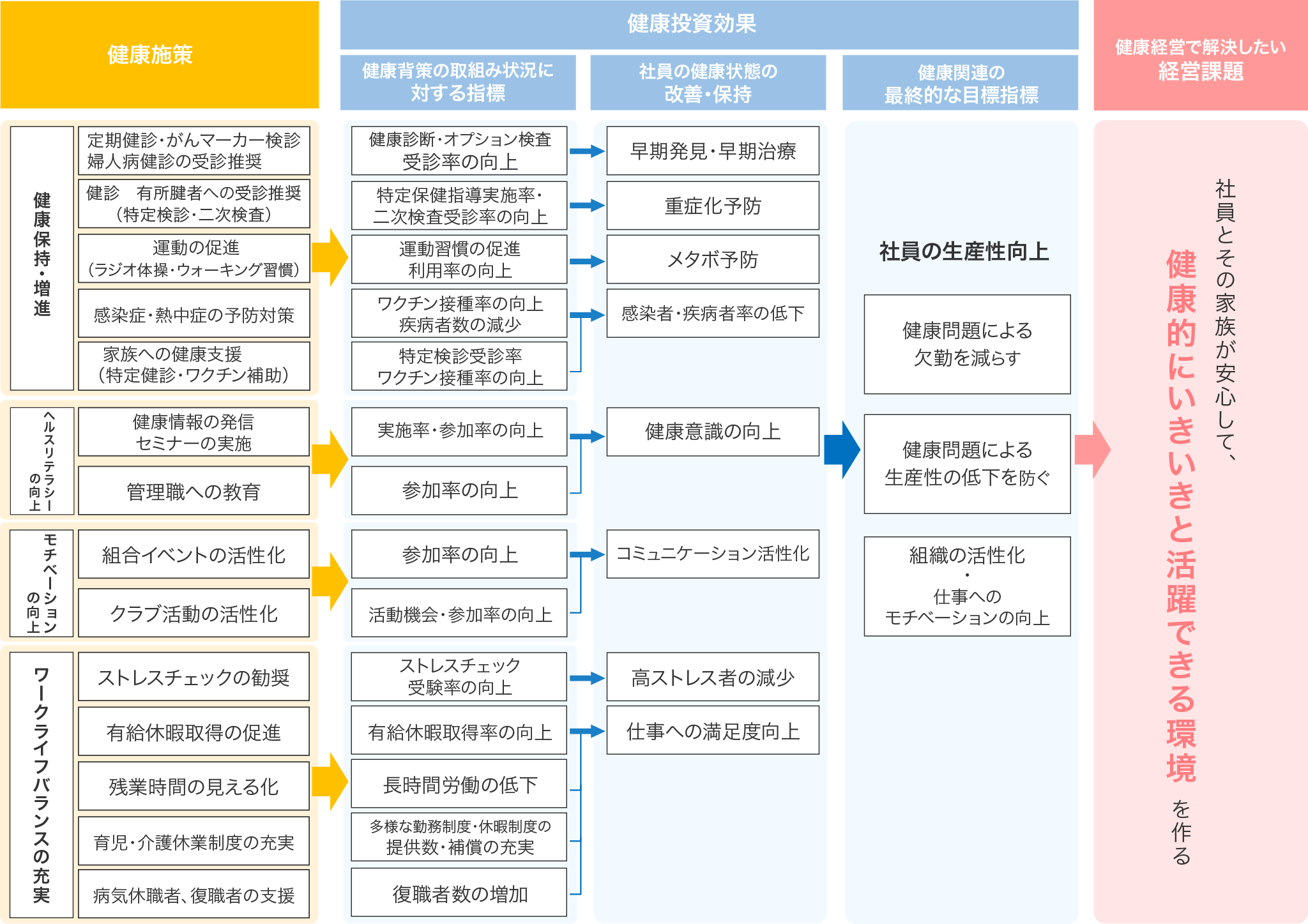 全ての社員とその家族が「安心して、健康的に活躍できる環境」を作るため、以下のマップに沿って取り組みを行ってまいります。